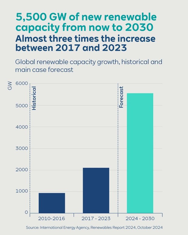 The renewable energy sector is booming, driven by surging clean power demand. The IEA forecasts renewable capacity to grow 2.7x to 5,500 GW by 2030, with solar leading at 80%.